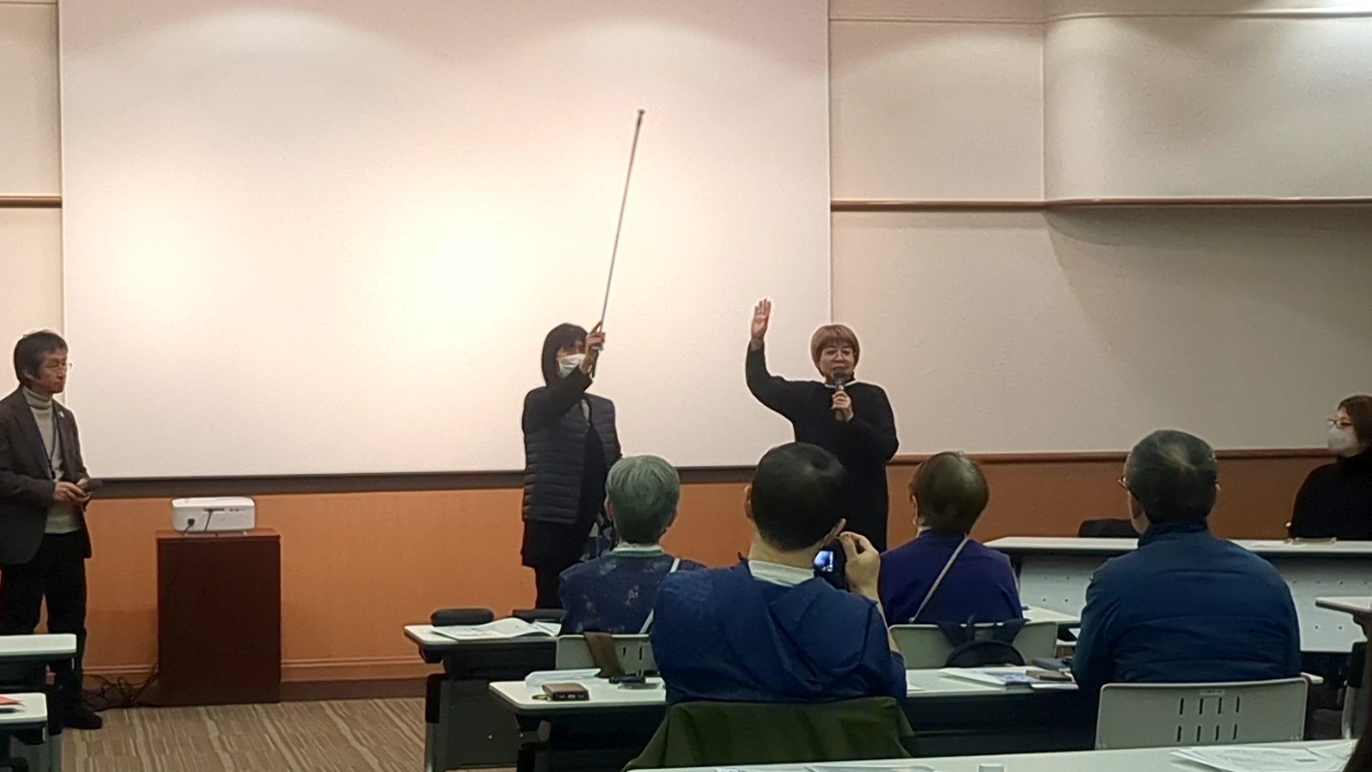 座学の様子。なぜユニバーサルツーリズムが求められるのか、視覚障害者や車椅子の対応について学びました。