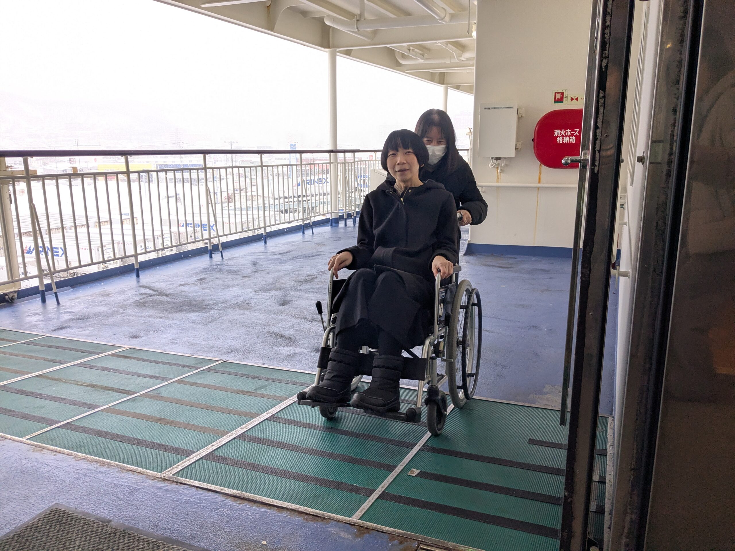車椅子体験は段差のある場所や、客室の通路、エレベーターなどで実施。フェリー船内をぐるっと回り、実際の観光地に近い感覚で体験できたのではないでしょうか。