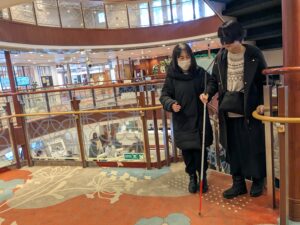 白杖を頼りに階段を上ります。声掛けの仕方や、どのように誘導したらよいかを実際に体感できました。