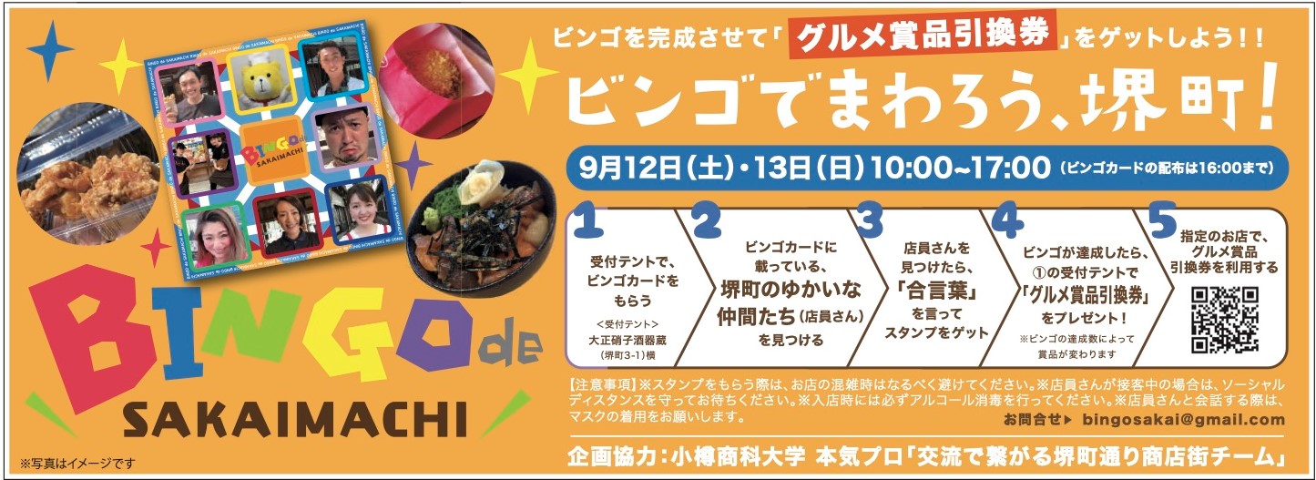 ビンゴを完成させて、堺町の「グルメ賞品引換券」をゲットしよう! ① 受付テントで、ビンゴカードをもらう(受付テント:大正硝子 酒器蔵 横(堺町3-1)) ② ビンゴカードに載っている、「堺町とゆかいな仲間たち(店員さん)を見つける ③ 店員さんを見つけたら「合言葉」を言ってスタンプをゲット ④ ビンゴが達成したら、①の受付テントで「グルメ賞品引換券」をプレゼント! ※ビンゴの達成数によって賞品が変わります。 ⑤指定のお店で、グルメ賞品引換券を利用する