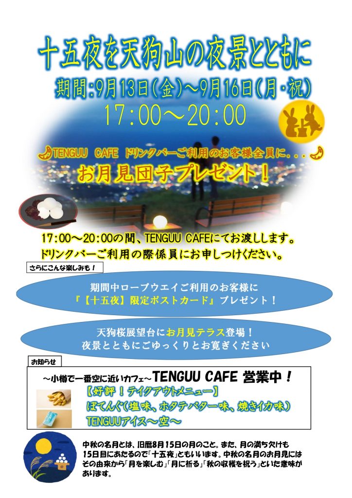 9月に入り、もうすぐ「中秋の名月」「十五夜の夜」を迎えます。小樽で夜空にいちばん近いカフェ「TENGUU CAFE」も好評な小樽天狗山では、十五夜の夜にちなみ、9月13日(金)~9月16日(月・祝)の期間でイベントを開催いたします!