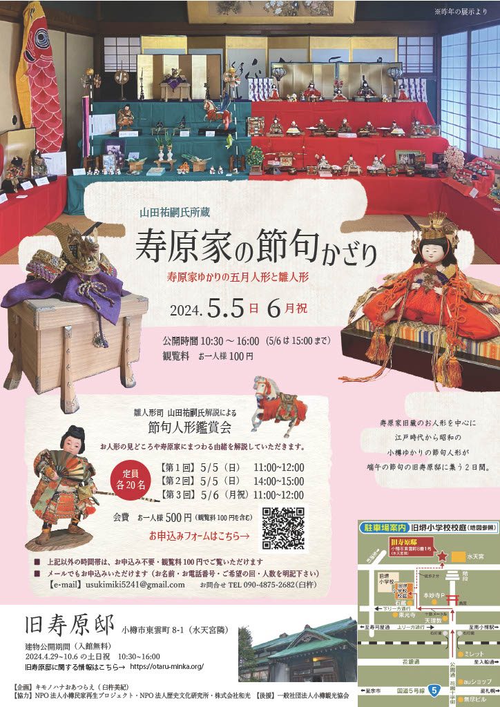 5月5、6日2日間の日程で【山田祐嗣氏所蔵 寿原家の節句飾り鑑賞会】が行われます。 札幌の雛人形司・山田祐嗣所蔵の小樽ゆかりの江戸時代から昭和初期までの五月人形・雛人形を旧寿原邸に展示し、解説付きの鑑賞会を行います。
