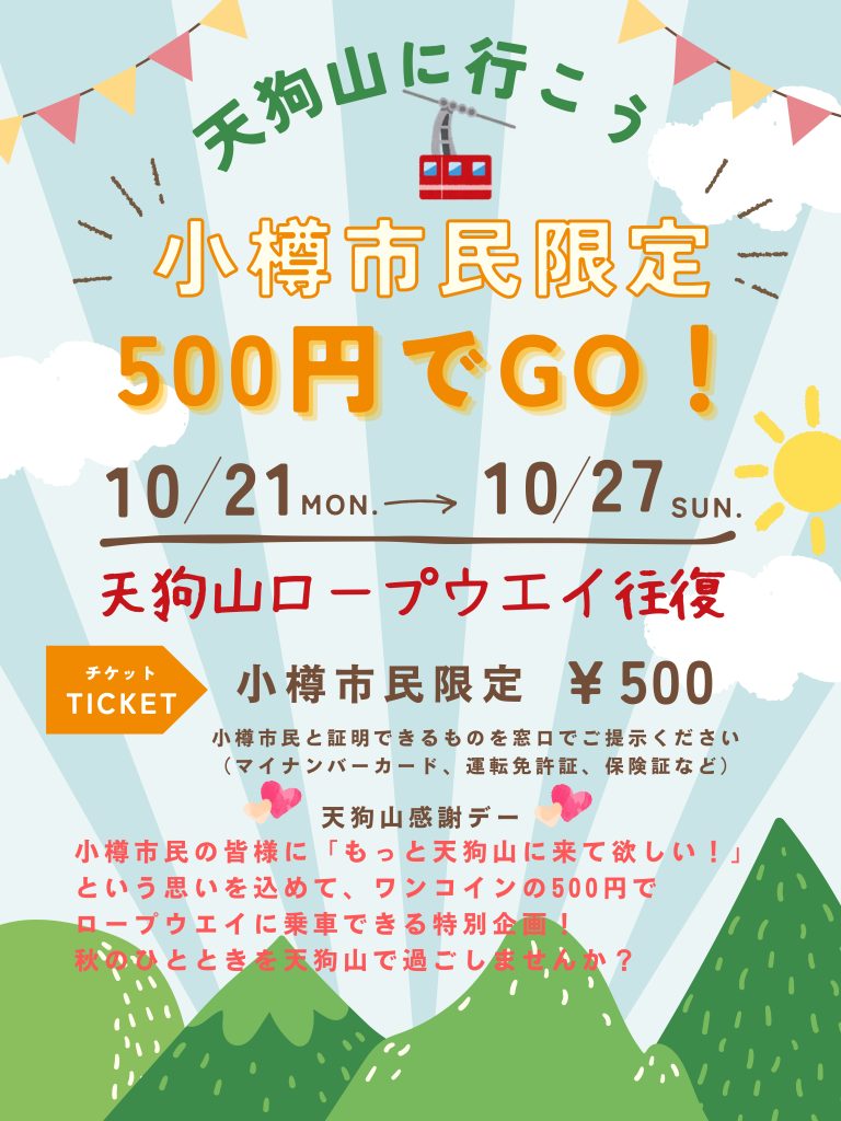 小樽市民の皆様に「もっと天狗山に来て欲しい!」という想いを込めて、ワンコインの500円でロープウエイに乗車できる特別企画!