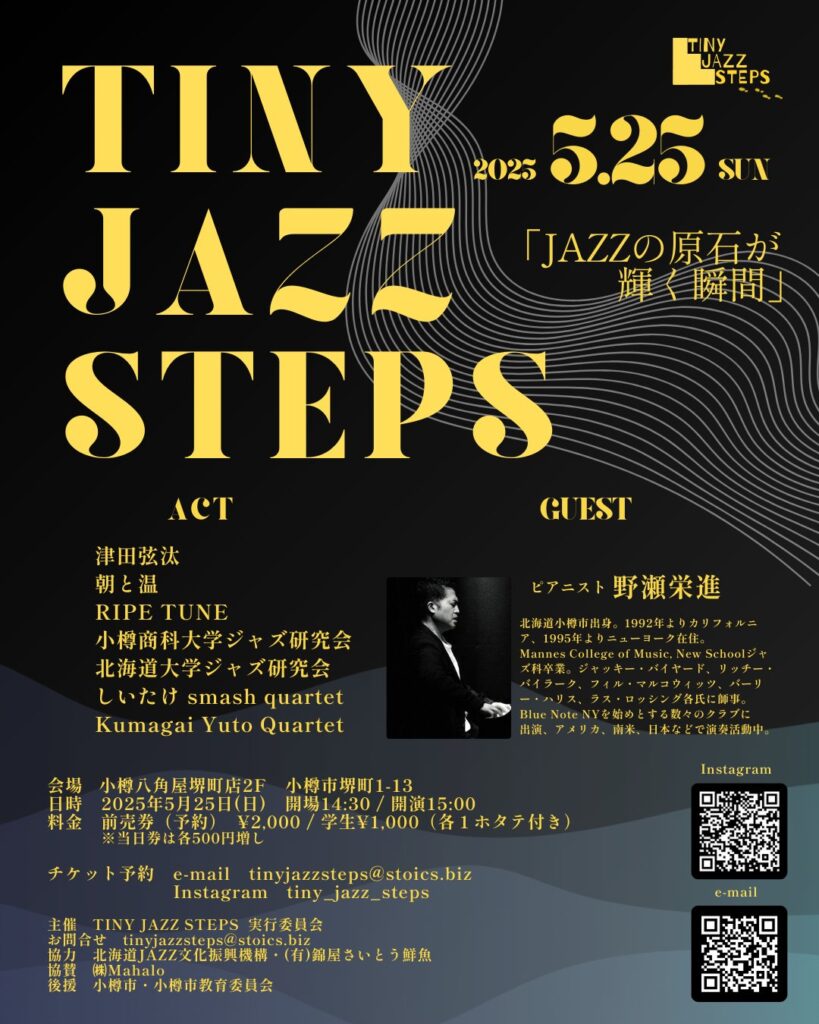 TINY JAZZ STEPS 開催! 学生アーティスト総勢7組出演! そしてなんと全組演奏終了後に、ピアニスト野瀬栄進氏とのセッションもレアな見どころとなっております。  : 2025年5月25日(日) 小樽市堺町1-13 小樽八角屋 堺町店 2F open 14:30 start 15:00 前売り一般¥2,000 学生¥1,000(各1ホタテ付き) ※当日券は各500円増 ご予約をおすすめします。