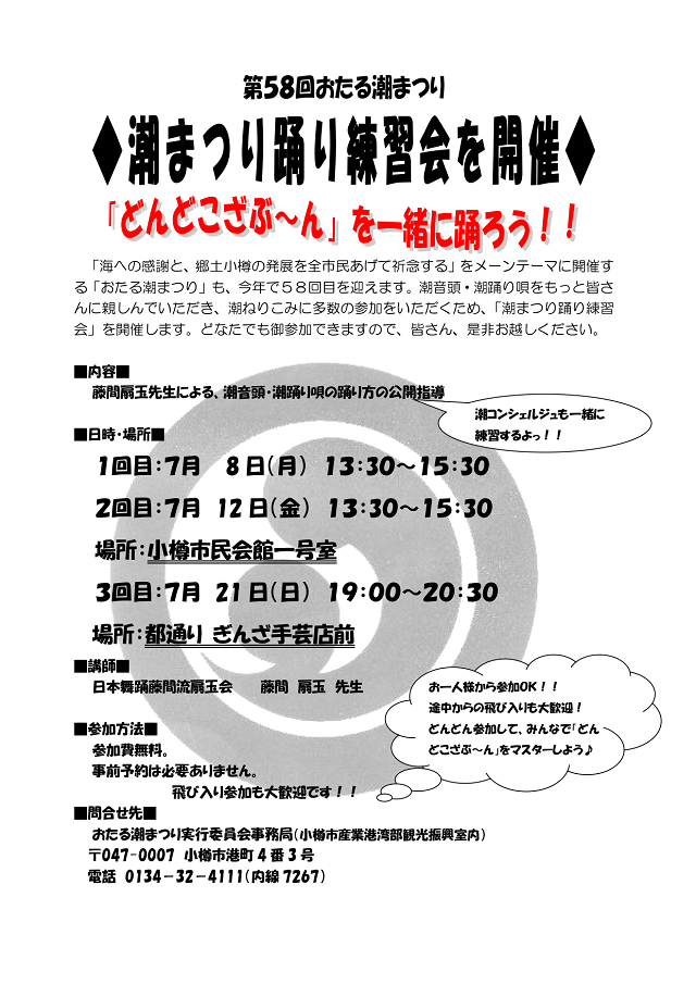 「海への感謝と、郷土小樽の発展を全市民あげて祈念する」をメーンテーマに開催する「おたる潮まつり」も今年で58回目を迎えます。潮音頭・潮踊り唄をもっと皆さんに親しんでいただき、潮ねりこみに多数の参加をいただくため、「潮まつり踊り練習会」を開催します。どなたでも御参加できますので、皆さん、是非お越しください」