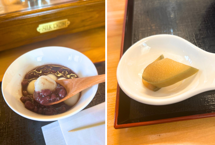 士幌産の豆で調理した自家製あんこがたっぷり乗った「白玉ぜんざい」は、見た目も味も贅沢な一品で、漬物も付いてきます。
