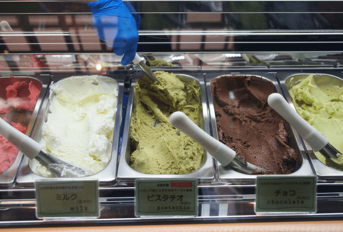 ジェラートの味は、生の素材をできるだけ活かすのがポイントで、時には加熱した素材やピューレも活用して、オリジナルジェラートに拘るお店です。特に和のジェラートがオススメで「おはぎジェラート」が大人気だったそうで、今回は品切れでした。そして、取材時にはまだ発売されていなかった「笹団子ジェラート」も、現在は販売が始まっています。お米をつぶして作ったお米ジェラートに、笹の葉の粉をまぜて、あんこを合わせるんだって。なんだかすごくおいしそう!
