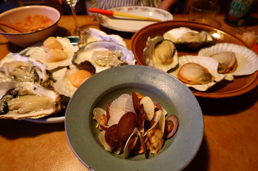 活ホタテは子供たちと一緒にミートナイフで初めてさばきました、パクパクと動くホタテに子供たちは大興奮!ホタテとカキは生とスチームで、ワインに合うようにレモンをきかせたサルサソースを添えました。ホタテの稚貝はアヒージョに。冷えた白ワインで乾杯しながら、今日一日の出来事を振り返ります。