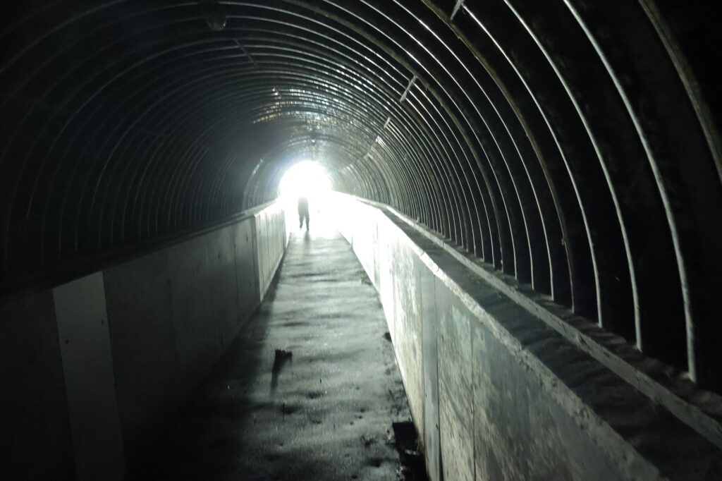 15時30分、積丹半島といえば日本海に突き出た神居岬が有名ですが、ちょっと遠回りして島武意海岸へ。海岸近くの駐車場から散策道を進むと、大人の両手を広がると壁に触れるほどの狭く真っ暗なトンネルにさしかかります。