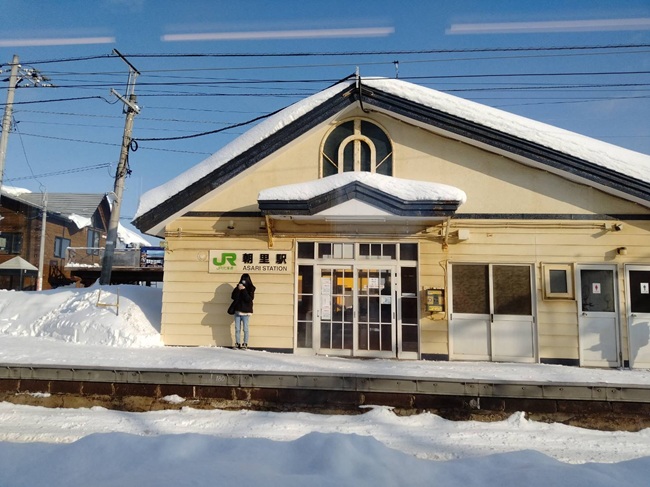 (↓1/28 9:00過ぎ...札幌から小樽に向かうJR電車の中から、青空の広がる雪の朝里駅です。)[ヨ]