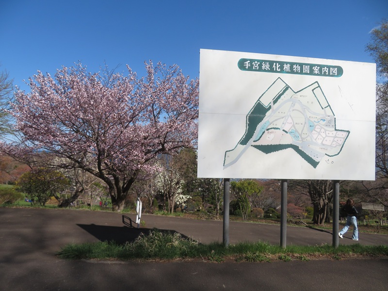 「手宮緑化植物園案内図看板」横の桜が満開。