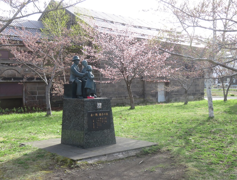 赤い靴の親子の像とブランコがある側の桜
