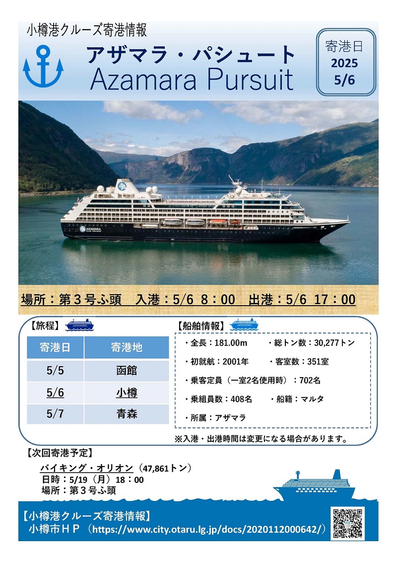 クルーズ船「アザマラ・パシュート」が寄港予定です。