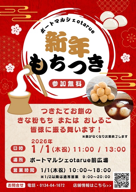 1月1日(木・元旦)には、「新年もちつき」で、つきたてのお餅を皆さまに振る舞います。