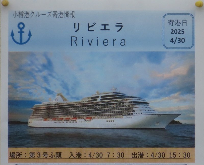 クルーズ船「リビエラ」が寄港予定です。小樽港初寄港のクルーズ船となります。