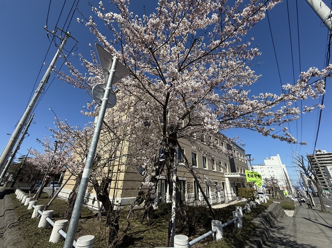 4月21日午前10時頃と23日の午後2時頃の小樽警察署の桜です。