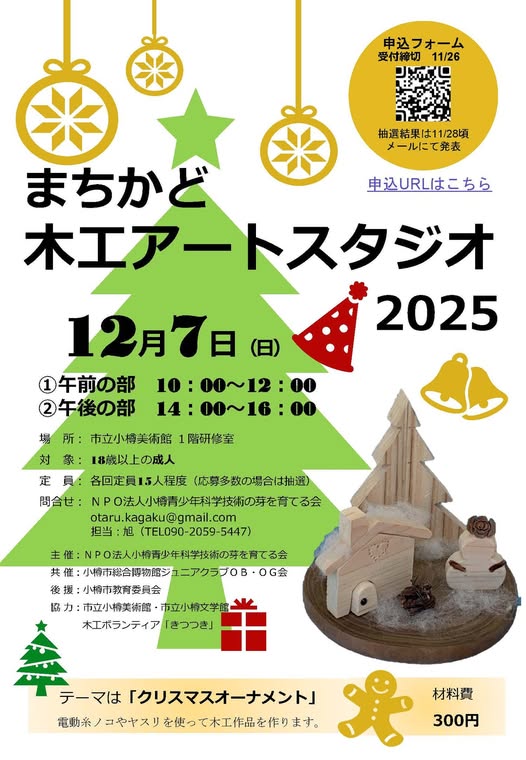 大人向け木工教室が市立小樽美術館の研修室で開催されます。