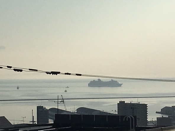 (↓今朝7時前、入航直前のセレブリティ・ミレニアム…勝納ふ頭に寄港)[ヨ]