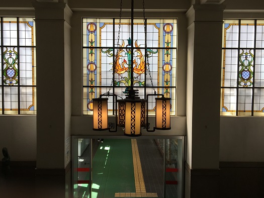 (↓小樽市役所本館から別館への通路の上にはステキなステンドグラスが…今回写真を撮っていたら女性職員の方に電気を付けたらいいですよと言って頂きました。ありがとうございました。) [ヨ]
