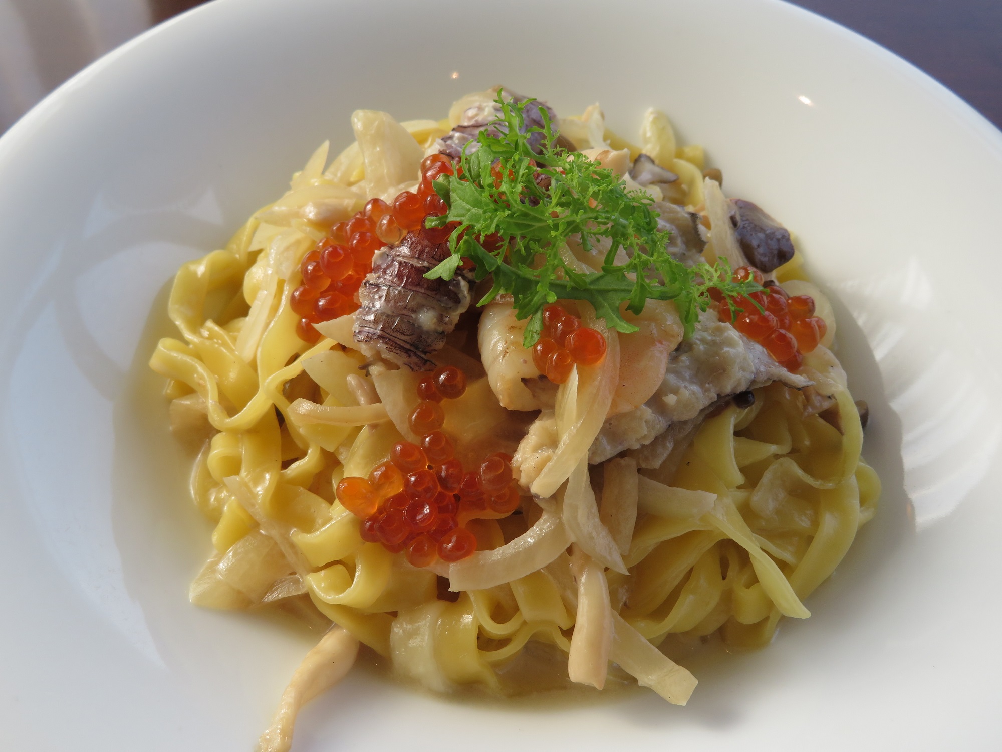 メインディッシュを「シャコのクリームパスタ」にしました。