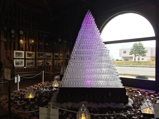 (↓11/10お昼過ぎ運河プラザ前庭の浮き玉ツリーとプラザ内のワイングラスタワー)[ヨ]