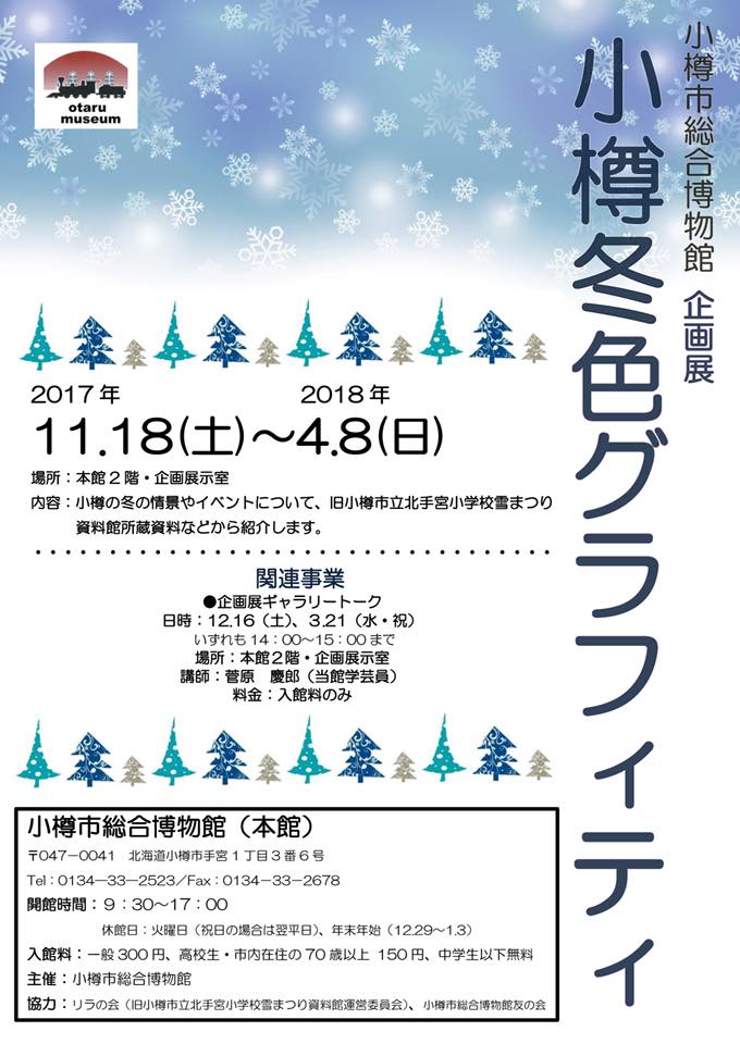 小樽市総合博物館本館・企画展 小樽冬色グラフィティ 小樽の冬の情景やイベントについて、 旧小樽市立北手宮小学校雪まつり資料館所蔵資料などから 紹介します。 11月18日(土)~4月8日(日) […]