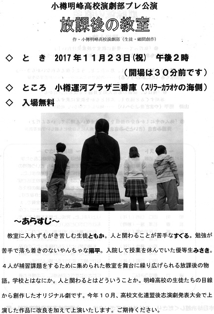 11月23日(木・祝)に、運河プラザで三番庫で 小樽明峰高校演劇部プレ公演「放課後の教室」が 行われました。 日頃、自分達が学校生活で悩んでいる事を題材にして 劇化した作品です。 大勢のの観客の中、一生懸命お芝居している […]