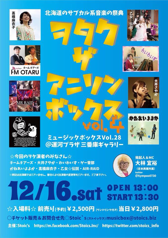 「第4回ヲタク ・ザ・アニソンボックスが、 運河プラザ三番庫で、12/16(土)午後1時半から始まり、 雪の中大勢の人で盛り上がりました。 少し遅くなりましたが、写真をご覧ください。 【ライブ13:30~19:00】 […]