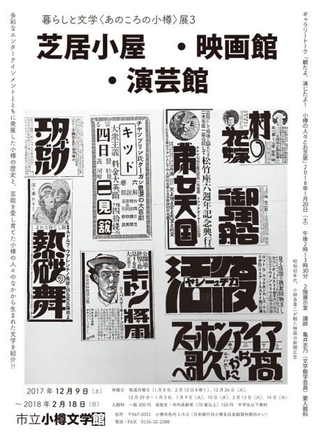 市立小樽文学館では12月9日(土)より、 企画展「暮らしと文学〈あのころの小樽〉展3 芝居小屋・演芸館・映画館」 を開催しています。 多彩なエンターテインメントとともに発展した小樽の歴史と、 芸能を愛し育てた小樽の人々の […]