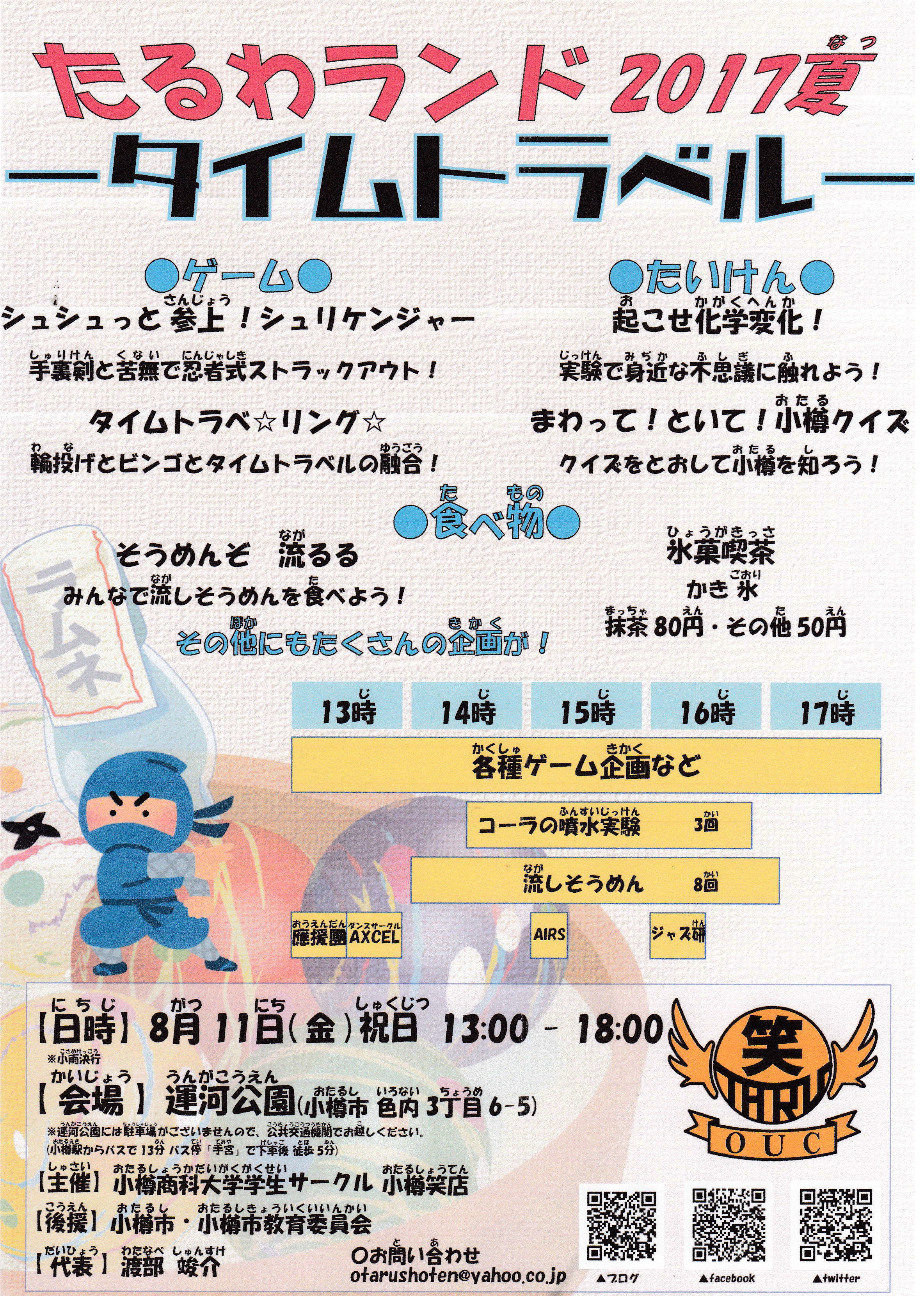 小樽商大学生サークル 小樽笑店 たるわランド2017夏 タイムトラベル 8月11日(金・祝) 13:00~18:00 会場:運河公園(小樽市色内3丁目6番5号) 小雨決行 参加費:無料(かき氷のみ有料) ●ゲーム ● […]