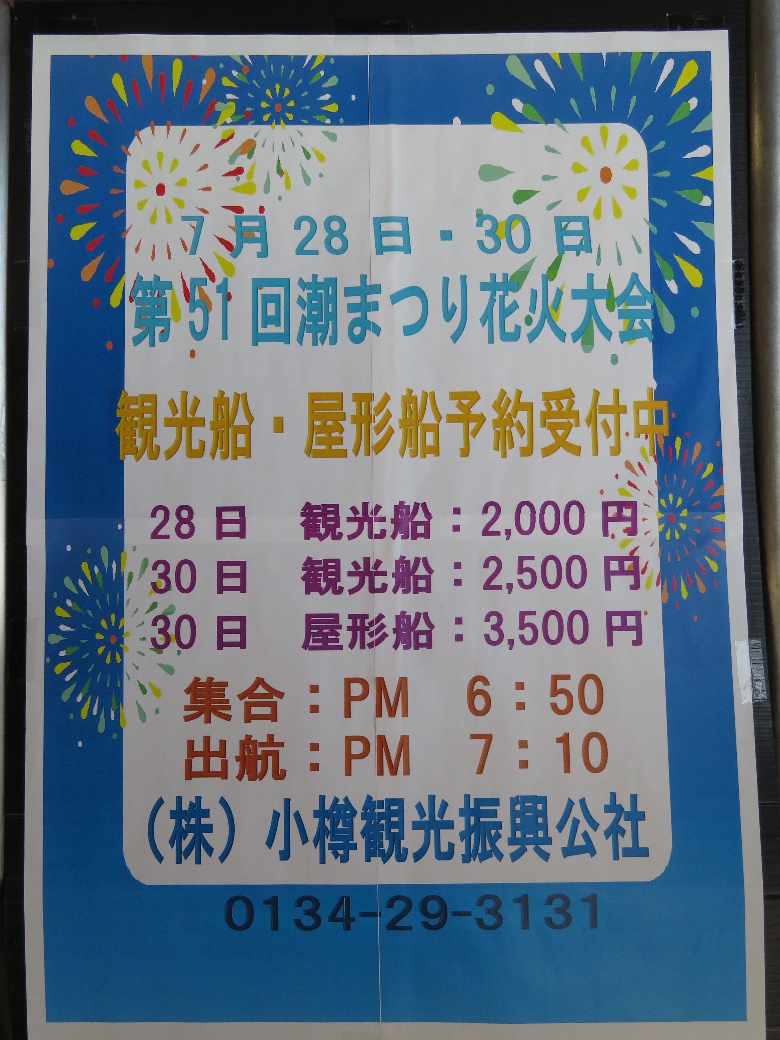 第51回 おたる潮まつり花火大会にあわせ 観光船と屋形船の特別運航を実施し致します。 船上からご覧いただく「花火」もきれいですよ。 今年は観光船と屋形船から 「おたる潮まつり花火大会」をご覧になりませんか。 現在予約受付 […]