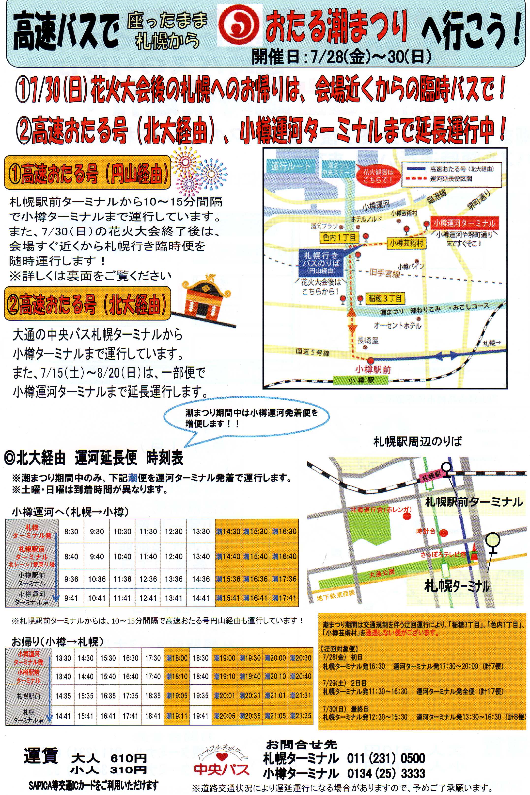 中央バスでは夏休み期間、 小樽~札幌間運行の高速バス 「高速おたる号北大経由」の下記運行便を 終着「小樽駅前」から「小樽運河ターミナル」まで延長します。 札幌から乗換なしで「小樽運河」や「堺町通り」へ行くことが出来、 と […]