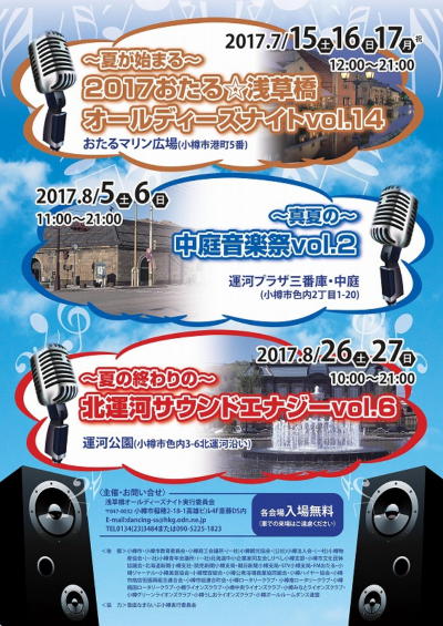 2017 おたる☆浅草橋オールディーズナイトvol.14 7月15日(土)・16日(日)・17日(月・海の日) 時間:12:00~21:00 開場:おたるマリン広場 入場無料 今年は例年になく暑い日が続いて […]