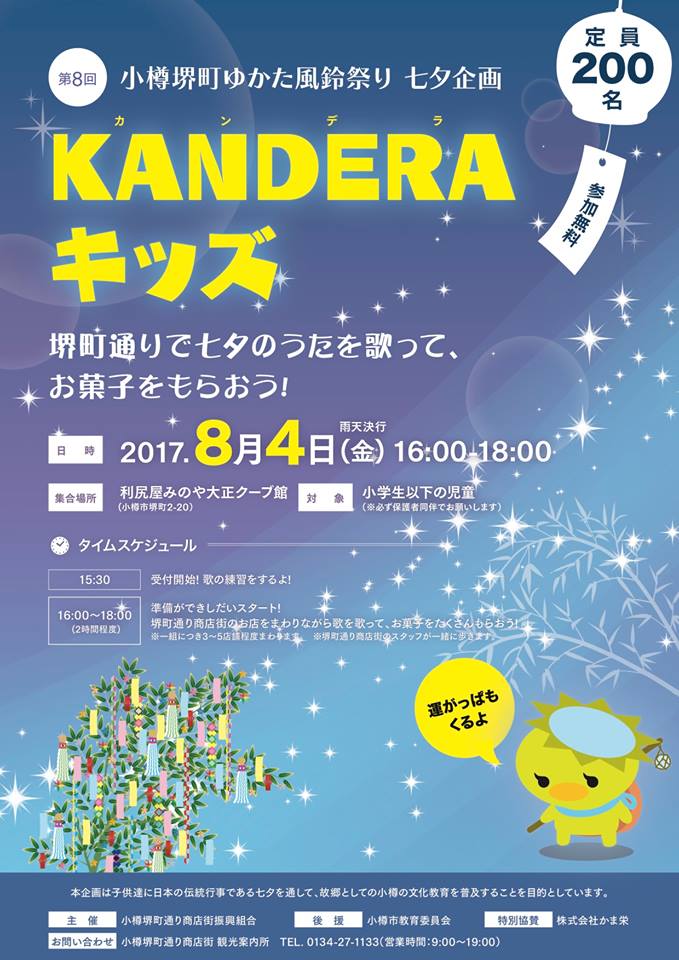 小樽堺町ゆかた風鈴祭り七夕企画『KANDERA キッズ』を開催します。 小学生以下の児童が対象必ず保護者同伴でお願いします。 参加者は先着200名参加無料です。 堺町通りで七夕の歌を歌ってお菓子をもらおう! 運がっぱも参 […]