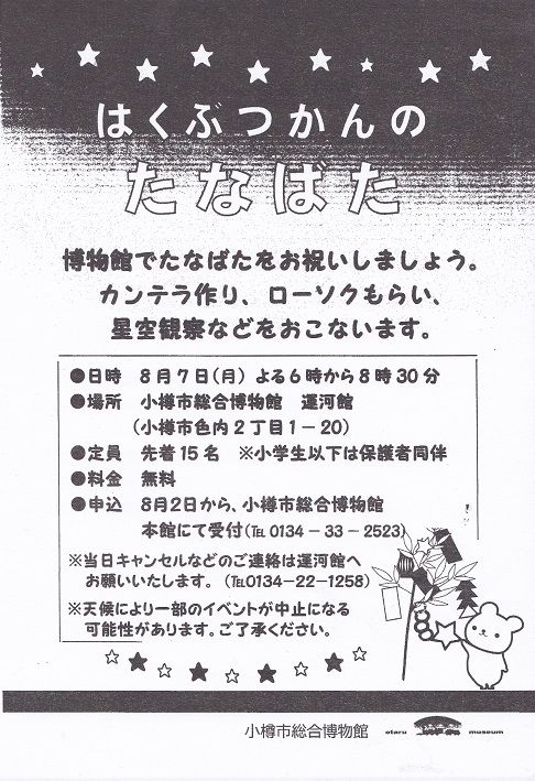 うんがかんのたなばた…総合博物館・運河館 8月7日(月) 18:00~20:30 カンデラづくり、ローソクもらい、星空観察などを行います。 場所:総合博物館・運河館 小学生以下は保護者同伴 定員:15名 申込先⇒総合博物 […]