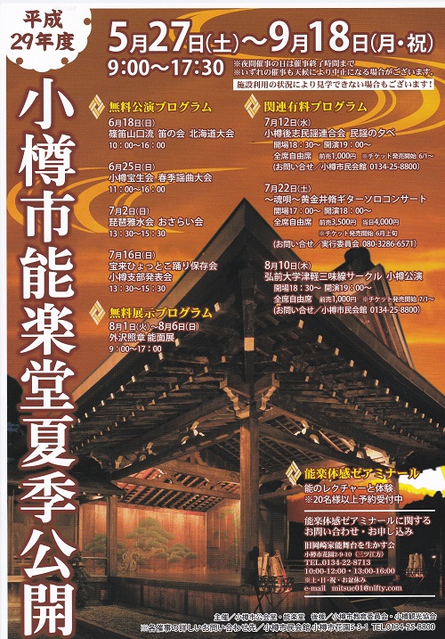 今年も『小樽市歴史的建造物指定』の 「小樽市能楽堂夏季公開」が始まります。 k k 小樽市能楽堂夏季公開 開催日時:2017年5月27日(土)~9月18日(月・祝) 9:00~17:30 ※ 夜間 […]