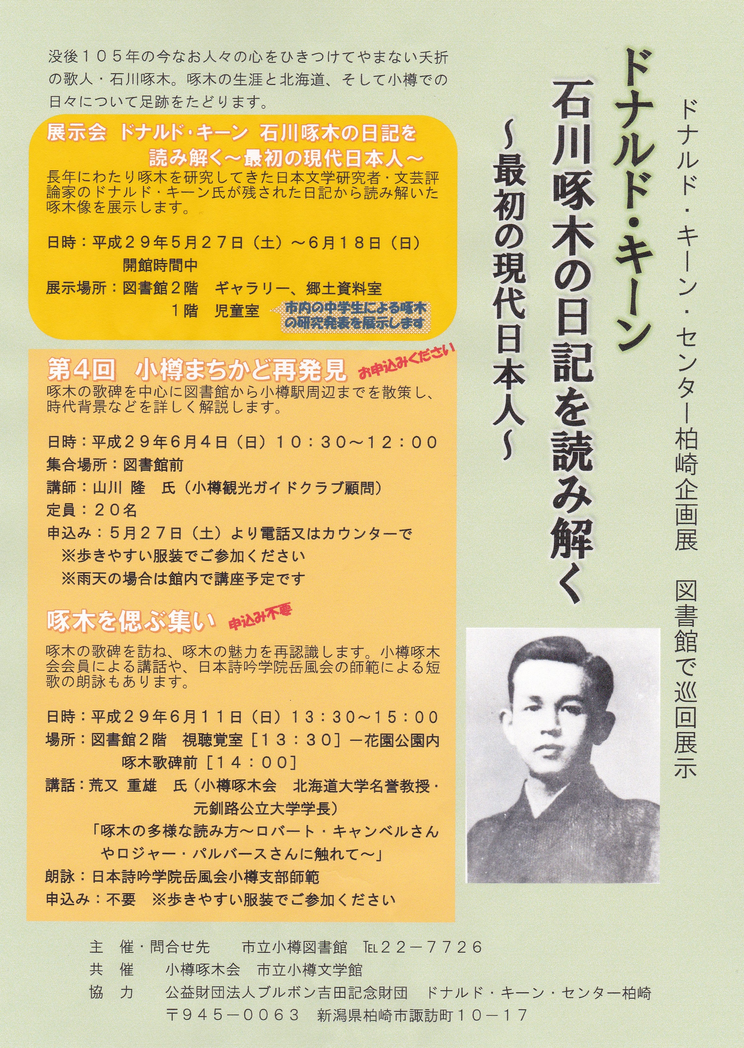 市立小樽図書館で開催予定の企画展とイベントをご紹介いたします。 ・ ドナルド・キーン 石川啄木の日記を読み解く〜最初の現代日本人〜 没後105年の今なお人々の心をひきつけてやまない 夭折の歌人・石川啄木。啄木の生涯と北海 […]