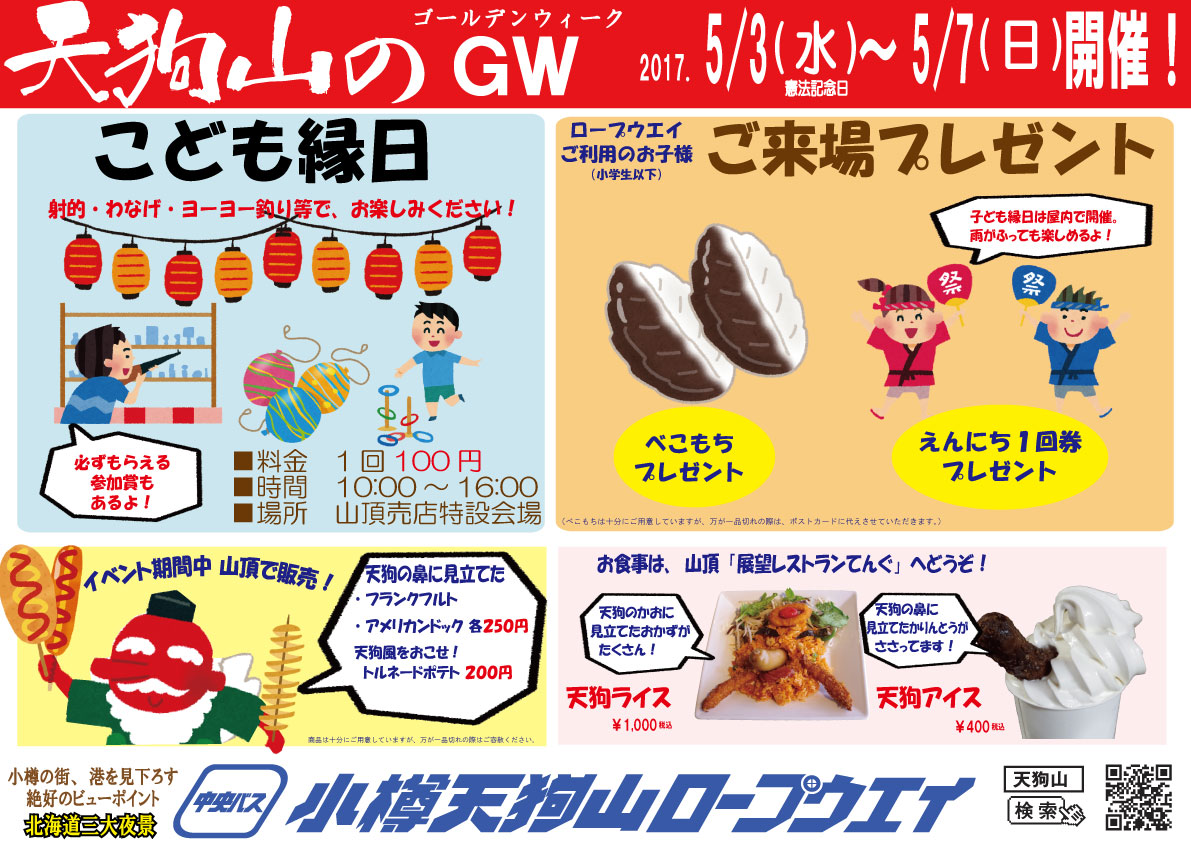 小樽天狗山では、ゴールデンウィーク期間中イベントを開催いたします。 親子共々楽しめる催しもので皆様をお迎えいたします。 天狗山山頂からは小樽市内を一望でき、 素晴らしい眺めを楽しむことができます。 ぜひ、お出かけください […]