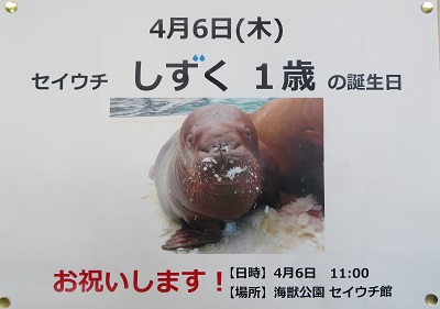 昨年、おたる水族館で誕生した セイウチの赤ちゃん「しずく(メス)」は 4月6日に1歳の誕生日を迎えます。 4月6日(木)11:00からの セイウチのショー「セイウチのお食事タイム」の中で ホッケの切り身と氷で作ったバース […]