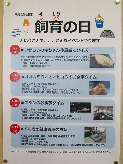 公益社団法人日本動物園水族館協会では、 4月19日を419(しいく)「飼育の日」としています。 おたる水族館では飼育の日にちなみ、 4月19日にイベントを開催しました。 あ ●ゴマフアザラシの赤ちゃんの餌付けのお話 ~じ […]