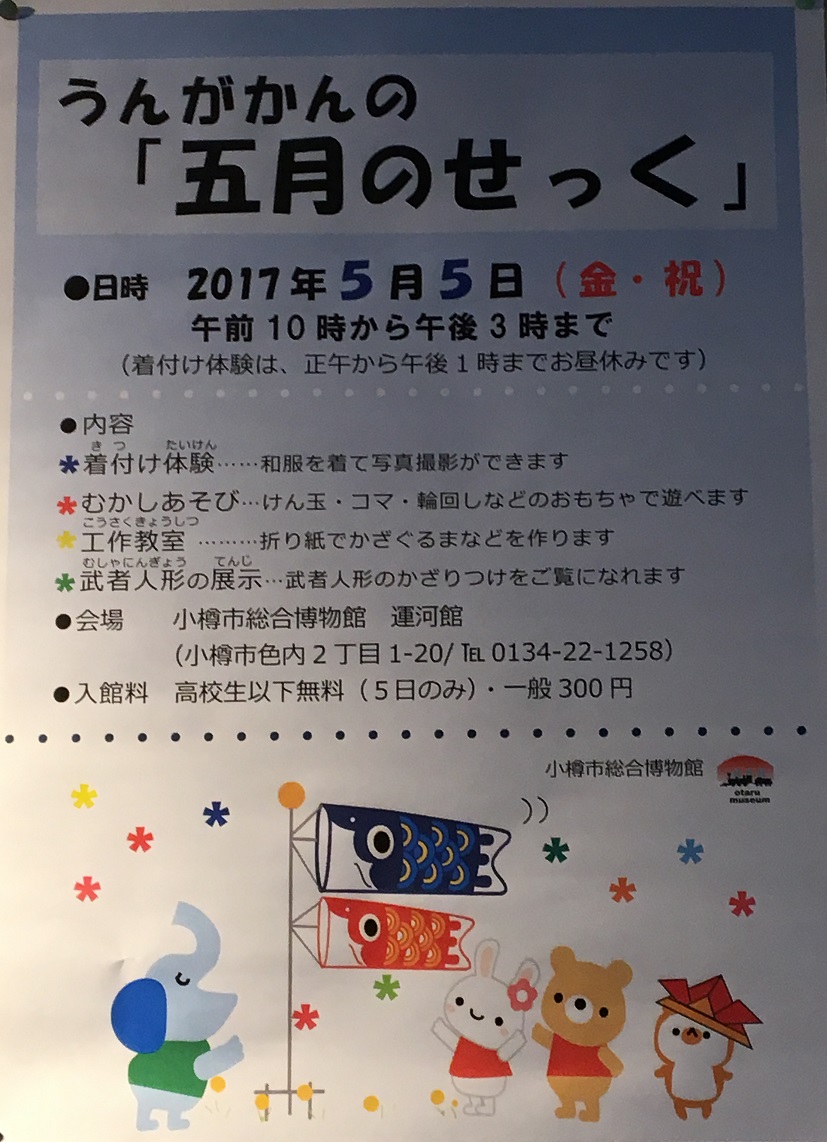 ?うんがかんの「五月のせっく」? 5月5日(金・祝) 10:00~15:00 こどもの日、小樽市内の公的機関の施設は高校生以下は入館料が無料になりますので どうぞご家族、お友達とお出かけになりませんか?! […]