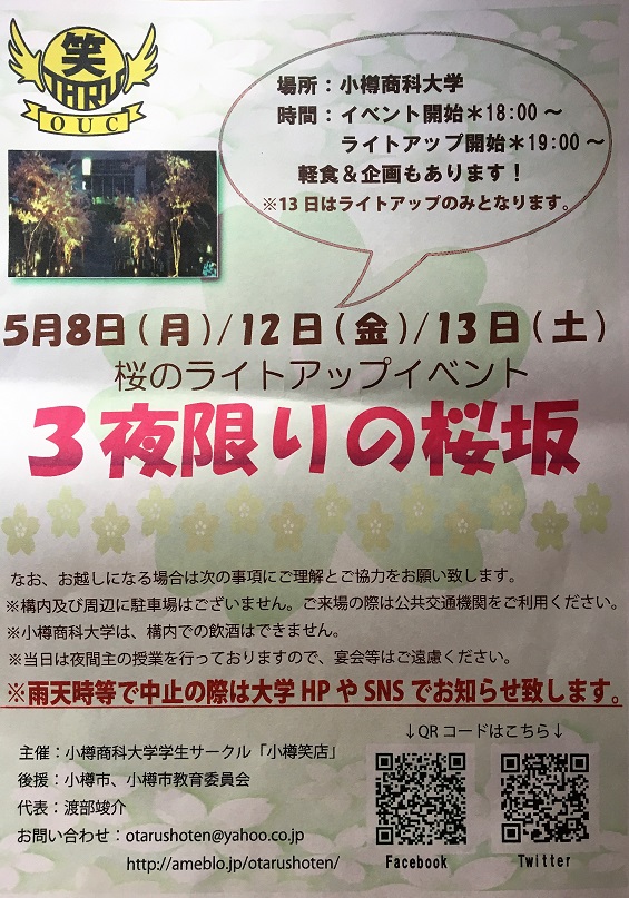 桜のライトアップイベント ? 3夜限りの桜坂 ? 大学構内で行うイベントで、学生と地域の方々との交流の場となる事を 願って開催される「小樽笑店」が行う自主イベントです。 5月8日(月) 12日 […]