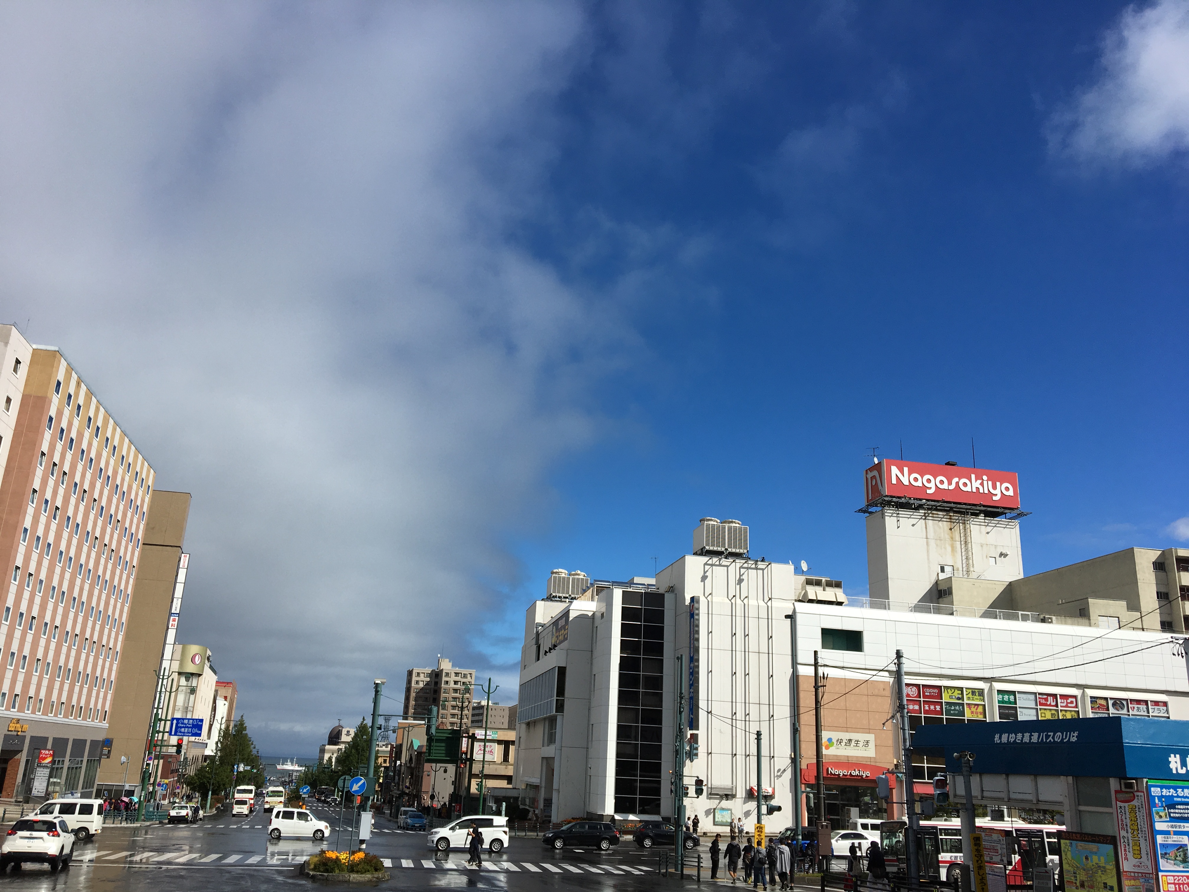(↓10/7のお昼過ぎの小樽駅からの風景。雨が上がり、一瞬半分青い空に…)[ヨ]