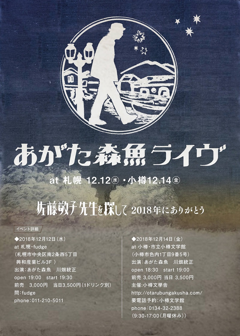 12月14日(金)市立小樽文学館にて あがた森魚さんのライブを開催します。 ・ ♬あがた森魚ライヴ at 小樽文学館 ・「佐藤敬子先生を探して 2018年にありがとう」♬ ・日時:2018年12月14日(金) 開場 18 […]