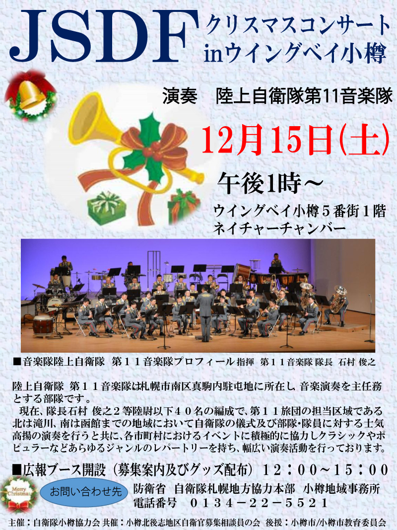 ウイングベイ小樽で開催されるクリスマスコンサートの第2弾。 12月15日に陸上自衛隊第11音楽隊によるクリスマスコンサートが 5番街1階ネイチャーチャンバーで開催されます。 どうぞ、お友達やご家族をお誘い合わせの上お出か […]
