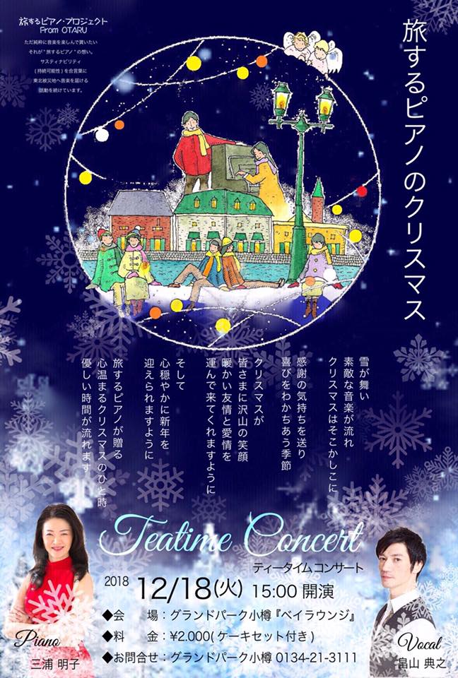 2018年12月18日(火) グランドパーク小樽「ベイラウンジ」にて、 「旅するピアノのクリスマス」を開催します。 グランドパーク小樽のパティシエ特製スイーツ(ケーキ5個セット) をいただきながら、 小樽市在住のピアニス […]