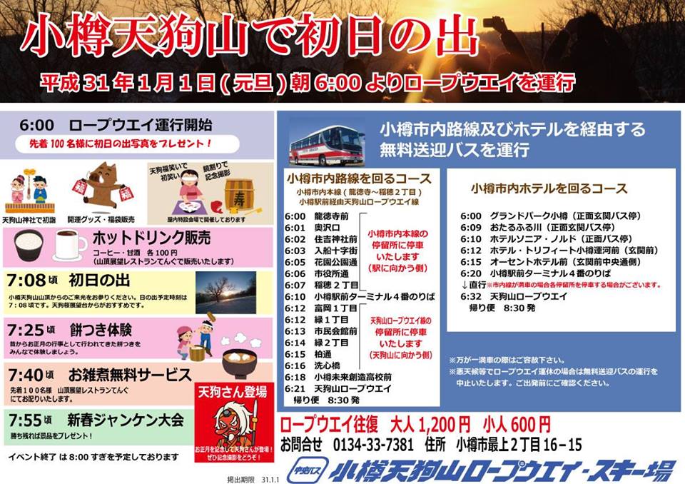 小樽天狗山ロープウエイでは、平成31年元旦(1月1日(火)) 朝6時からロープウエイを運行いたします。 山頂展望台から初日の出のご来光を拝み、小樽最高所に位置する天狗山神社にて初詣。 日の出前には、澄んだ空気と静寂の中に […]