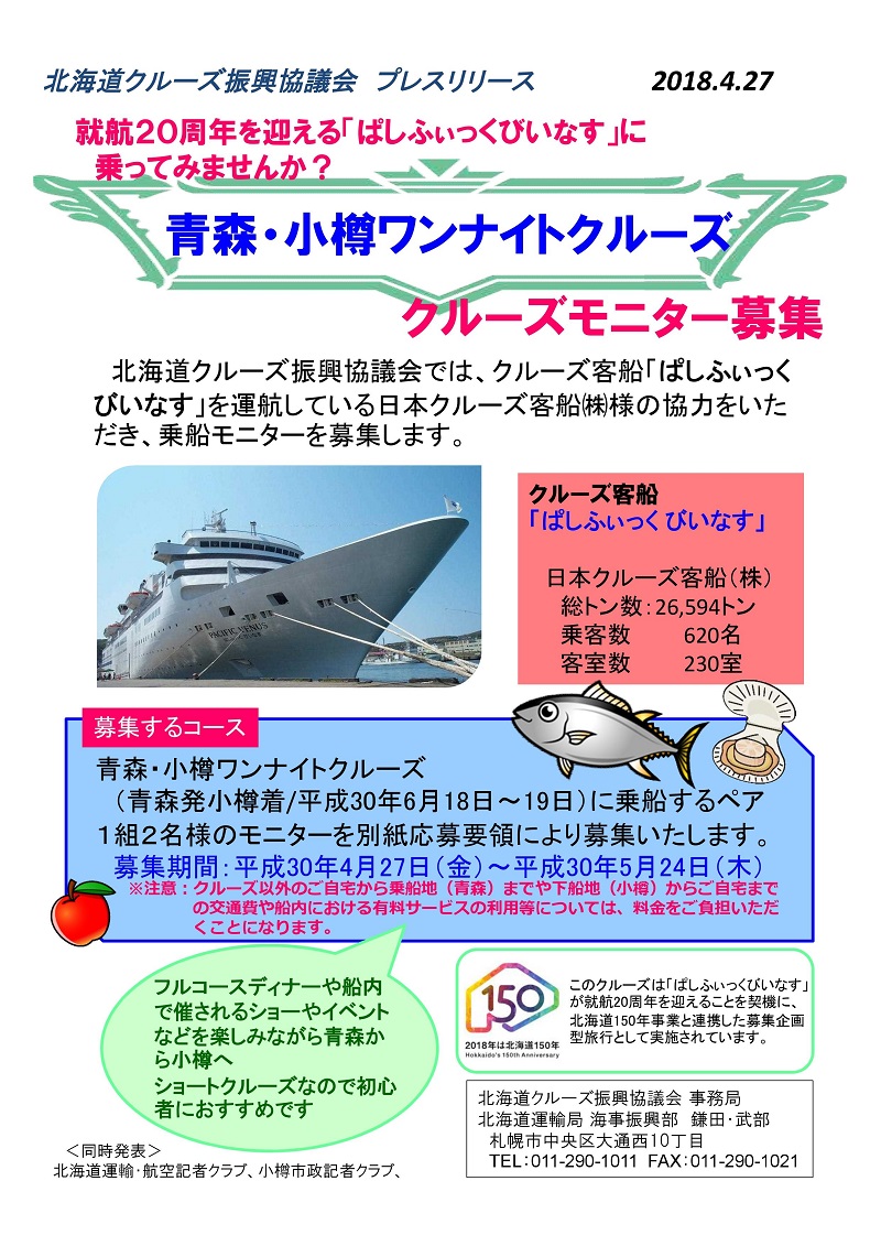 就航20周年を迎える「ぱしふぃっくびいなす」に 乗船してみませんか。 今回、北海道クルーズ振興協議会では、 クルーズ客船「ぱしふぃっくびいなす」を運航している 日本クルーズ客船(株)様のご協力をいただき、 青森発小樽着「 […]