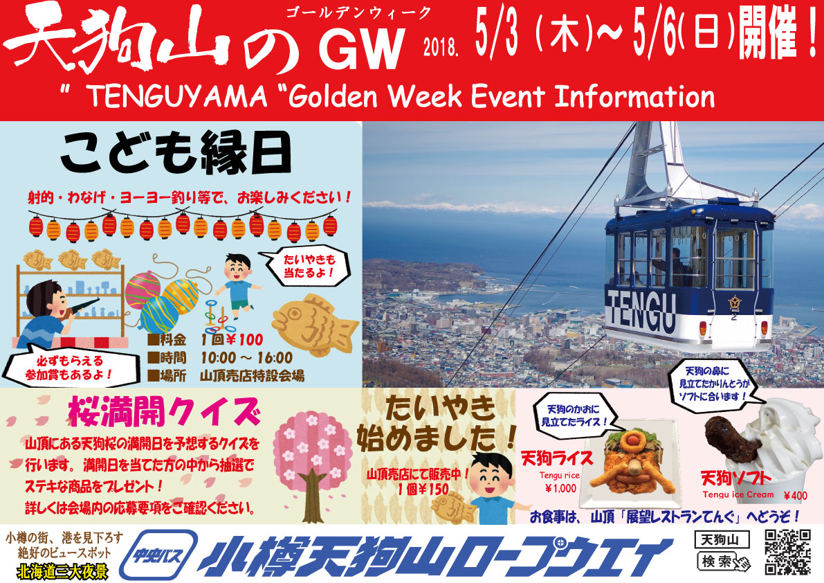 小樽天狗山ロープウエイでは、5/3(木・祝)~5/6(日)のゴールデンウィーク期間中、 ロープウェイ山頂駅特設会場で「子ども縁日」を開催いたします。 親子共々楽しめる催しもので皆様をお迎えいたします。 天狗山山頂からは小 […]