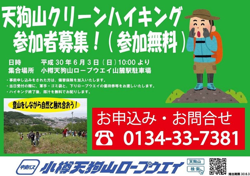 天狗山「クリーンハイキング(清掃登山)」のお知らせです。 小樽天狗山観光振興会では平成30年6月3日(日)に、 小樽天狗山の山開きイベントとして、 スキー場内(ゲレンデ・駐車場)を清掃しながら登山を行う 「クリーンハイキ […]